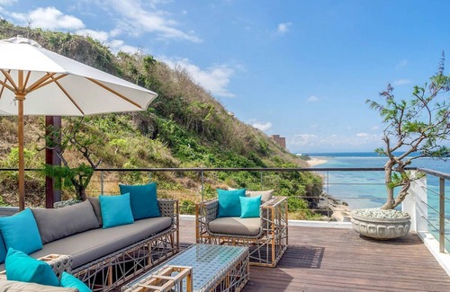 Villa Grand Cliff Nusa Dua is a spectacular five-bedroom property carved into the southernmost cliffs of Bali’s Bukit Peninsula. There are 5 bedrooms and 5 bathrooms, accomodating up to 10 people. 2 beds can be added for an additional cost.
