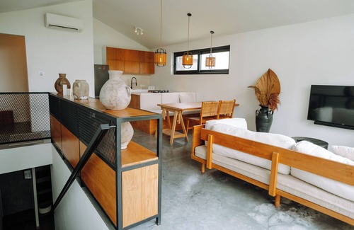 Set within a lush 8-are garden, the property features two separate houses (both entirely yours during your stay), each with an inverted floor plan that maximizes garden views and natural airflow.